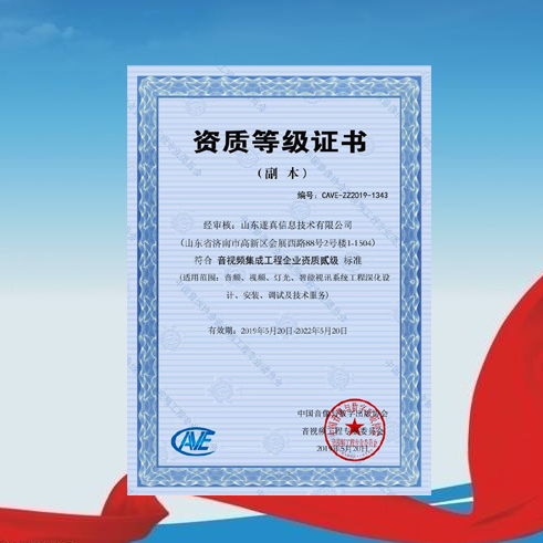 公司獲得中國音像協會音視頻工程專業委員會頒發的《音視頻集成工程企業資質貳級》證書,成為省內首批通過該權威機構認證的二級資質企業。